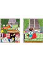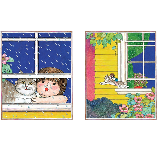 第10、11 頁──小男孩騎著貓咪飛越在屋頂和天空,吸引著街道上和房子裡的眾多眼睛。找找看!油漆工人怎麼啦?巴士站旁的小男孩,用什麼來瞄準他?而大巴士裡有人探出車外,他手上握著什麼東西呢?