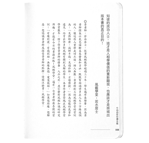 作者將其多年在國學和相學的研究,融合表現在本書中,除了將書中原文給予簡單的白話解釋之外,更加上「陪讀」和「延伸應用」兩大部分,讓讀者可以按圖索驥,找到改變人生命運、人際關係的鑰匙。