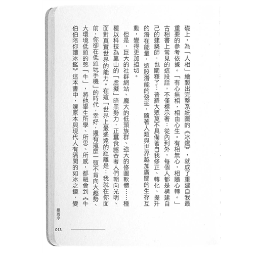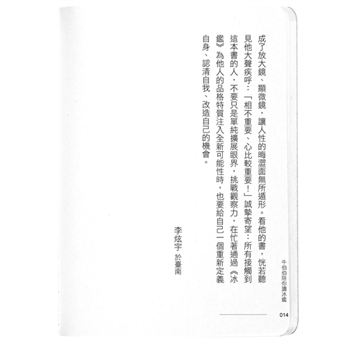 「在這『世界上最遙遠的距離是:我就在你面前,你卻在低頭玩手機』的時代,幸好,還有這麼一頭不肯向大趨勢、大環境低頭的憨『牛』,將他畢生所學、所思、所感,都融匯到這本書中,讓原本與現代人有隔閡的如冰之鏡,變成了放大鏡、顯微鏡,讓人性的晦澀面無所遁形。」
