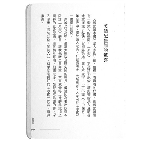 《冰鑑》一書,言簡意深,是一本奇書,也是帝王之書,但卻因為文言文的表述,常讓有興趣的讀者,無法享受書中所傳遞的深意,非常可惜。