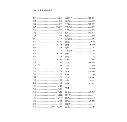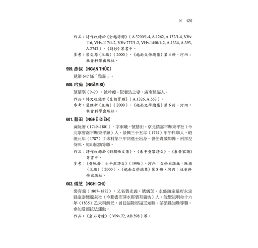 其次,這部《越南漢喃作家辭典》已替我們掃除了越南漢喃作家名號紛亂的障礙,透過書後的「作家字號索引」、「作家姓名索引」,我們可以很快查到作家的年代、籍貫與生平事蹟、重要著作。可喜的是,鄭克孟主編在介紹作家生平時,凡是遇有「曾出使中國」者都費心加以註明,碰到作家作品「已失傳」時也還是特意把作品名稱標示出來,例如「遜齋」黎有喬:「曾任副使出使中國」、「《北使效顰集》(已失傳)」,又如「子石」何文關:「曾出使中國」、「《燕行牙語詩藁》(已失傳)」……。我在想,如果中文讀者可以好好運用這些珍貴的線索,其實不無在中國尋獲越南使節部分失傳作品的可能。