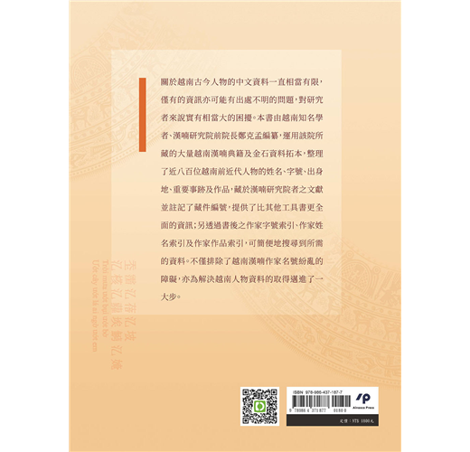 關於越南古今人物的中文資料一直相當有限,僅有的資訊亦可能有出處不明的問題,對研究者來說實有相當大的困擾。本書由越南知名學者、漢喃研究院前院長鄭克孟編纂,運用該院所藏的大量越南漢喃典籍及金石資料拓本,整理了近八百位越南前近代人物的姓名、字號、出身地、重要事跡及作品,藏於漢喃研究院者之文獻並註記了藏件編號,提供了比其他工具書更全面的資訊;另透過書後之作家字號索引、作家姓名索引及作家作品索引,可簡便地搜尋到所需的資料。不僅排除了越南漢喃作家名號紛亂的障礙,亦為解決越南人物資料的取得邁進了一大步。