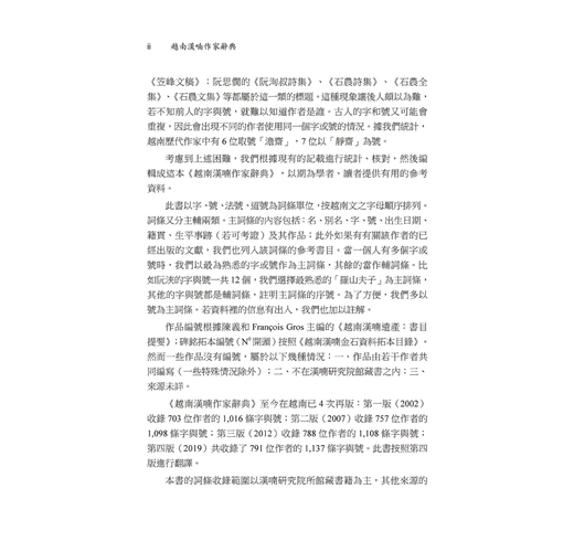 《越南漢喃作家辭典》由任職於越南社會科學翰林院所屬漢喃研究院(簡稱漢喃院)的鄭克孟前院長編纂,是為當今越南人物信息的權威來源。漢喃院是國際知名的學術機構,收藏了大量越南古籍和古文書,鄭克孟教授的《越南漢喃作家辭典》即以漢喃院厚實的一手史料為基礎,整理了791個越南前近代人物的姓名、字號、出身地、重要事蹟,以及傳世文獻清單,文獻中藏於漢喃院者還特別註記了具體的藏件編號,對有意瞭解該文獻的學者提供了極大的便利性。我們可以想見,根據一手史料進行近800個越南人物的信息整理,實為一件耗費時間心力的重大工程。本辭典經歷了長時間的編纂,於2002年在越南首度出版,迄今經歷三次修訂,在一手史料外亦吸納了越南學者長期以來的學術成就,中文版根據2019年最新增修的第四版譯成,可說是極為成熟的版本。原本越文版中的人物按越南語順序排列,不諳越語的讀者難以查閱使用;中文版在書後新增了中文排序的索引,極大地便利了中文讀者。前近代越南在東亞世界中極為活躍,書中所列人物不乏與中國、日本、韓國有互動者,讓本辭典成為不僅是越南研究,亦是東亞研究不可或缺的重要工具書。中譯本的出版,無疑是中文學界的大好消息。