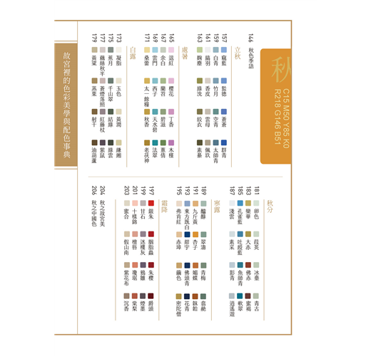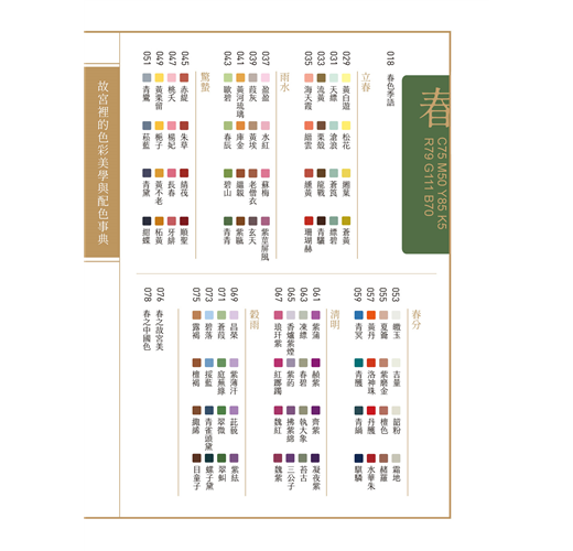 《延禧攻略》以清代乾隆朝為背景,根據乾隆十九年(1754年)至乾隆四十年(1775年)織染局之染作檔案統計,染物色總計如下:藍色系有魚白、玉色、月白、深藍、寶藍、石青、紅青、元青;黃色系有明黃、金黃、杏黃、柿黃、生沉香、麥黃、葵黃、秋香、醬色、古銅、米色、駝色; 綠色系有松綠、深官綠、黃官綠、官綠、瓜皮綠、水綠、砂綠、豆綠;紫色系有藕荷、深藕荷、鐵紫、真紫、紫紅、青蓮;紅色系有紅色、水紅、桃紅、大紅、魚紅。如此看,這份乾隆色譜實際上並不遜於劇裡的戲說。