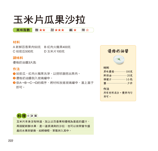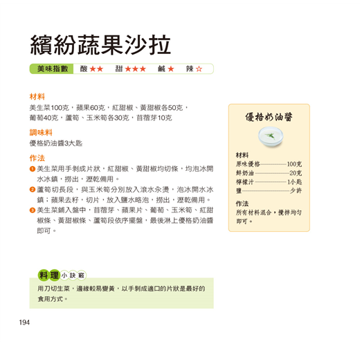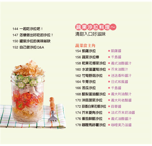 爽口沙拉輕鬆做,內容分為蔬果沙拉料理、海味沙拉料理和輕食沙拉料理三大單元,每道食譜皆附適合搭配的醬料作法,並提示料理訣竅,輕鬆做出多種口味的沙拉。