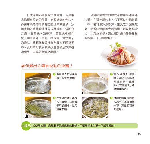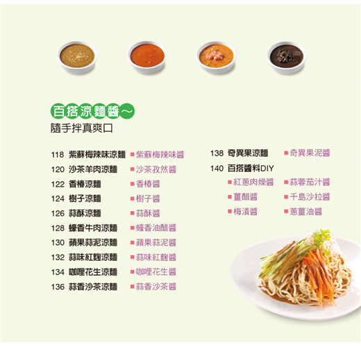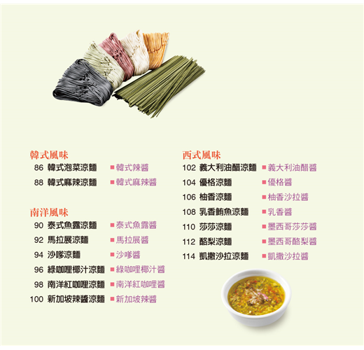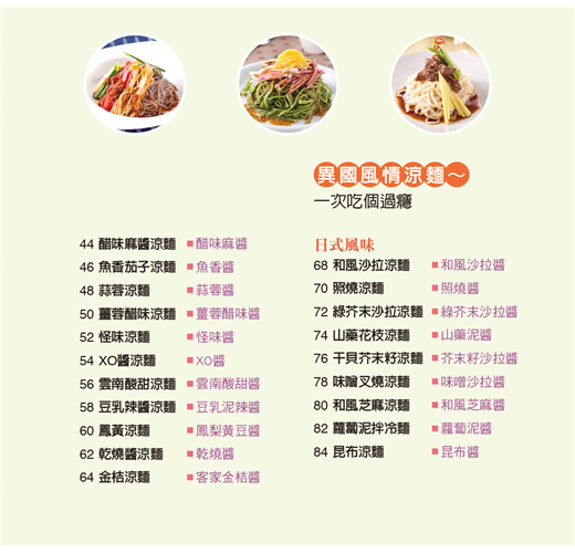 運用家常食材,將不同口味的醬汁加以創新,塑造出多彩繽紛、色香味俱全的涼麵美食,從傳統的麻醬涼麵、川辣涼麵到各國代表性涼麵,讓人暑氣全消、胃口大開。