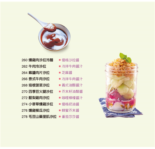 介紹90餘種美味醬料搭配涼麵、沙拉料理,隨手拌一拌,酸、甜、香、辣,任君挑選,自己在家做,天天換花樣!