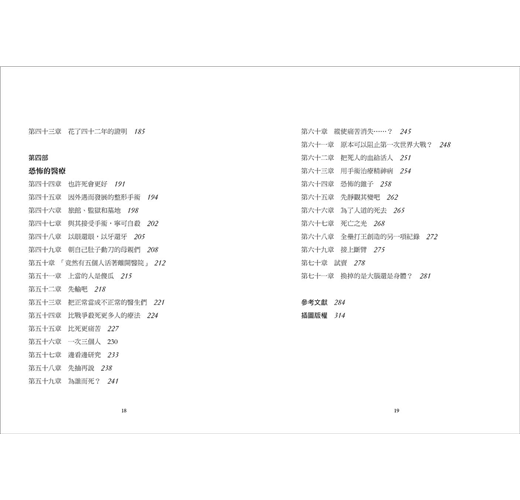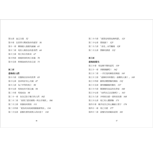 本書除了介紹了一些改變歷史的致命傳染病,以及與之戦鬥,付出生命的醫學工作者,也談到了一些令人毛骨悚然的醫學事故。