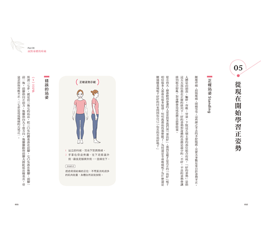 ‧如何維持正確的走姿、站姿、坐姿、睡姿,矯正平常的錯誤姿勢,藉由身體的正位練習,把身體的骨骼和筋膜線完全伸展開來,也能讓核心肌群可以好好地發揮作用