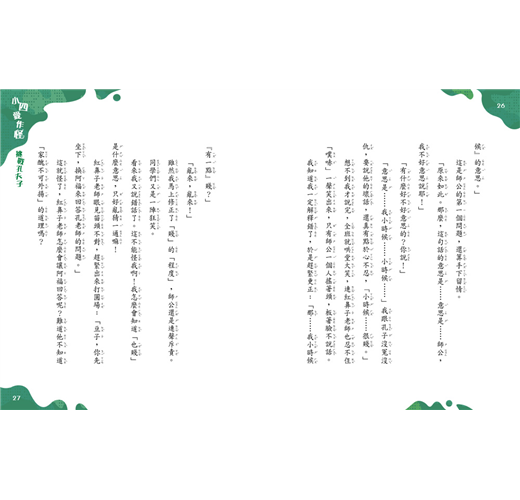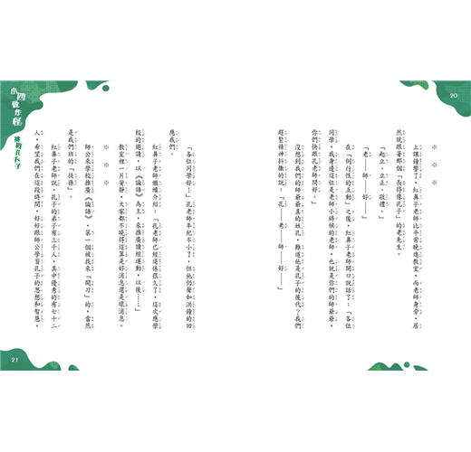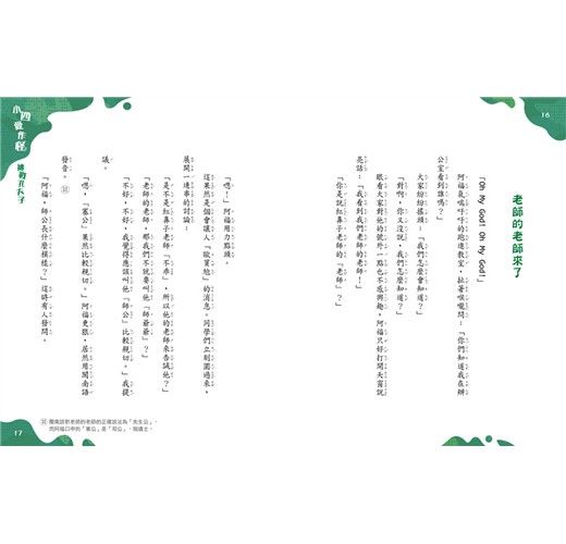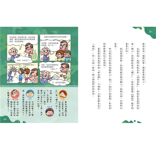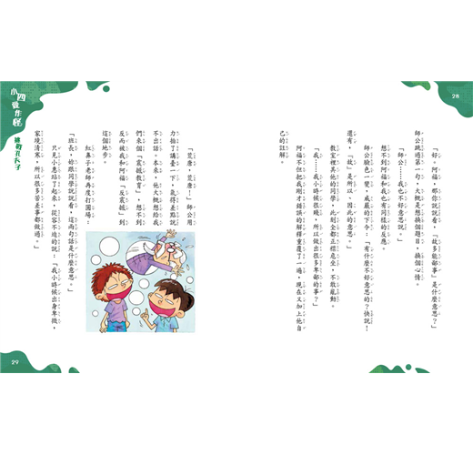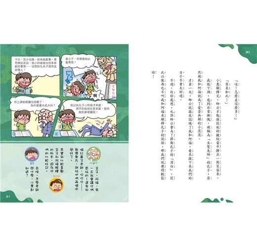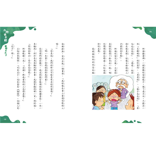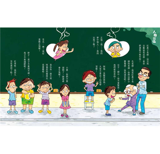 這套書由一群四年級孩子領銜主演。每本書的內容各成一個主題,以短篇章節呈現,每篇都有一幅爆笑的四格漫畫吸引讀者進入閱讀。在趣味無窮的閱讀中,引領孩子認識孔孟思想、三國演義、二十四孝、增進生態知識,並且學習與同儕相處、生命教育等人生議題!