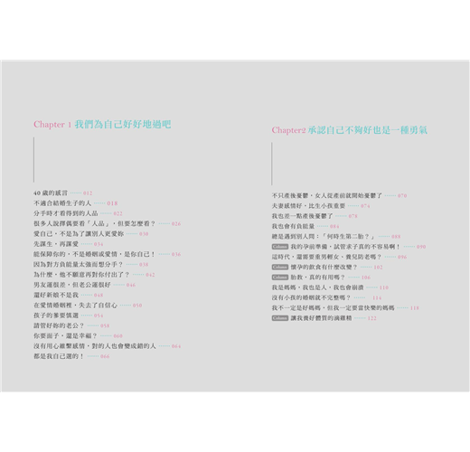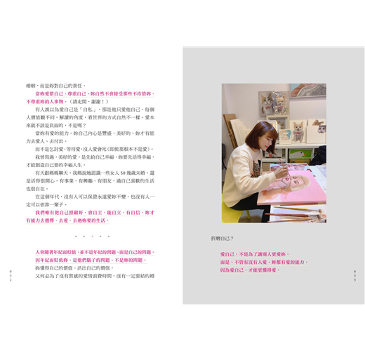 這本書中她強調了雖然為人妻、為人母,與過去的單身身分雖有不同,但「愛自己」的初衷絕對不能更改,不同的只是人妻和人母的角色,教會了她更多愛的課題,更體會不論人生經歷過多少挫折和失敗,都能看見世界的美好,讓自己成為更好的人。