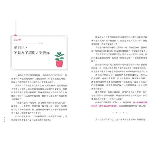 「為了結婚而結婚,為了找到伴而著急,其實都不是對的。最後失去了自己,得到的也不是真的幸福。」