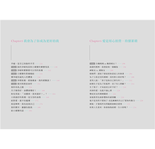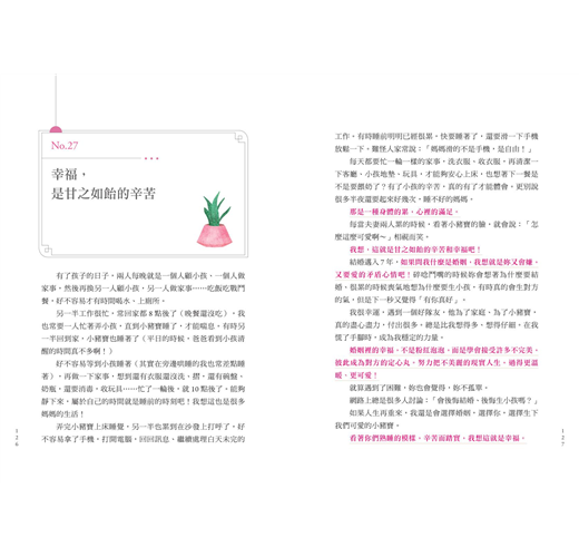 結婚生子經過這些年,對於兩性的書寫有更寬廣、不同以往的想法,生活中被可愛的小豬寶攻佔,這甜蜜的負荷讓她體會到,原來不論是否有了孩子,人生中的每一個人、每一件事的到來,都在讓她認識更多、更深的自己,過去常常糾結自己不夠好、不夠完美而沮喪和自我否定,現在的她懂得接受自己的不完美,也愛上生活本來就不美好的事實,學會接納、懂得欣賞,不要追求完美,而是慢慢成為更好的自己。有了孩子後,也更珍惜簡單微小的幸福快樂,也更懂得愛的意義。