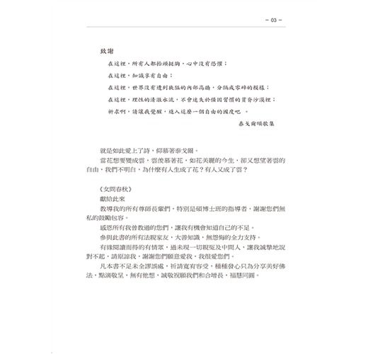 本書附贈由朱顏志工團隊合作,以中英文書寫〈十二名女子生命裡的悉達多〉之〈女問千秋〉流通版。分享就是難得,凡種種千秋常遇的千古大哉問,只要有所增益,請擇您所需,一切皆美。