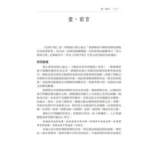 《女問千秋》書,學術版以博士論文「漢譯佛典中佛陀時期的佛教女性敘事研究」為內容,並增加閱讀標題。另外新增加實驗單元「黑白猜黑白想」於兩版本中,作為《女問千秋》中英文普及版的共時連結。