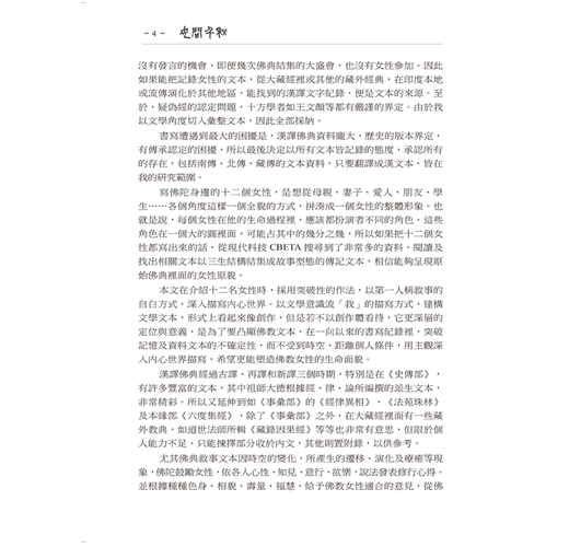 本論文為什麼寫佛陀時期的女性,因為想呈現最原始的狀態。佛陀是一個大智慧者,他對各種不同的女性說法,不過當時的印度女性實在沒有發言的機會,即便幾次佛典結集的大盛會,也沒有女性參加。因此如果能把記錄女性的文本,從大藏經裡或其他的藏外經典,在印度本地或流傳演化於其他地區,能找到的漢譯文字紀錄,便是文本的來源。至於,疑偽經的認定問題,十方學者如王文顏等都有嚴謹的界定。由於我以文學角度切入彙整文本,因此全部採納。