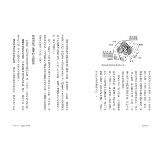 大腦是管控身體的器官,若身體有狀況,就會循著神經系統或化學分子信號,回報給大腦知道。然而,大腦卻沒有相同的生理機制,所以其對於自身退化的狀態往往懵然無知。