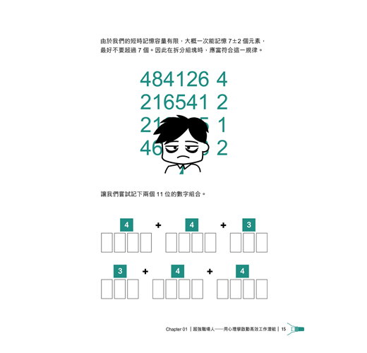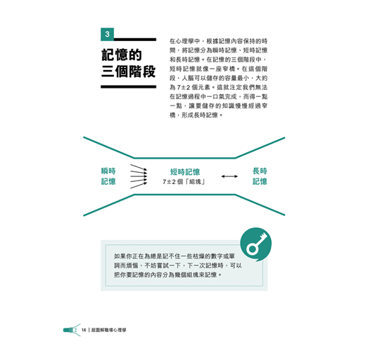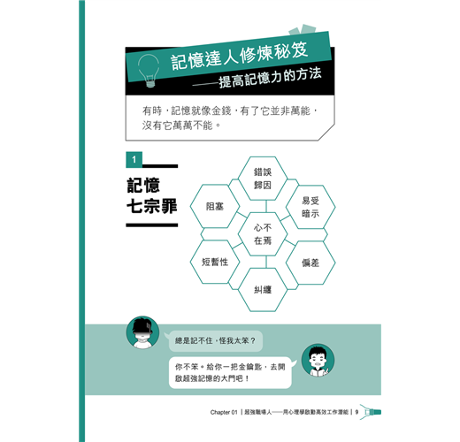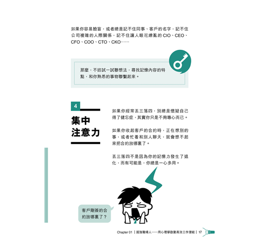 第一部分為超強職場人,即運用心理學知識來提升我們的職場競爭力。努力工作當然是取得成功必不可少的一個因素,但比努力更為重要的是方法和高效率。比如記憶,死記硬背和運用巧妙方法來記憶,效果迥然不同。「記憶達人煉成秘笈」這一節,講的就是如何科學運用記憶規律,在職場中更輕鬆、更高效地進行記憶的方法。
