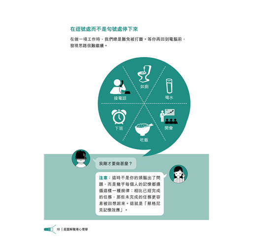 第一部分為超強職場人,即運用心理學知識來提升我們的職場競爭力。努力工作當然是取得成功必不可少的一個因素,但比努力更為重要的是方法和高效率。比如記憶,死記硬背和運用巧妙方法來記憶,效果迥然不同。「記憶達人煉成秘笈」這一節,講的就是如何科學運用記憶規律,在職場中更輕鬆、更高效地...