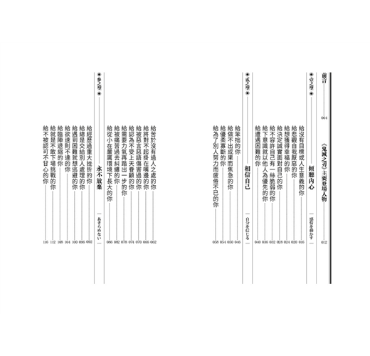 人生中所有的大小事,透過文字金句即時鼓勵和應援,都能成為讓你的內心能量強壯起來的重要來源。本書作者將人氣漫畫《鬼滅之刃》中,角色扭轉困境支持他們改變人生的重要金句,並且分門別類彙整成各種生活情境,提供人們在面對生命中的各種挫折或失意:「沒有目標或生存意義」、「做不出成果而焦急不已」、「被惡言惡語傷害過」、「被痛苦的過去所糾纏」、或者「從小在嚴厲環境下長大」等等,提出勇氣文字因應之道,作為你養精蓄銳,再次出發的能量補給。不管在人生哪個轉角面臨了失意、困頓或失去幸福的能力,都能從本書中找到重新喘息、強化自身的能量文字!