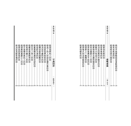 「書的編排和各章標題讓人很容易就進入原創故事之中,就算沒有看過漫畫也不影響閱讀。每一篇的標題更是貼近時下年輕人的煩惱,強烈建議可從自己在意的地方開始讀,很快就能找到對症下藥的句子。特別適合那些不擅於將內心情緒轉化為具體文字的人,這本書有助於理清自己的想法喔。」