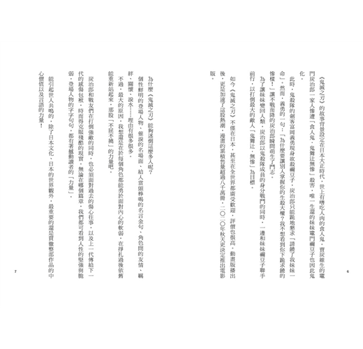 《鬼滅之刃》出了許多名言金句,本書的優點不僅結集金句,還會下像是「給優柔寡斷的你」這樣大標,針對常見的各種煩惱對症下藥。讀者可以透過分類,立刻找到最能打動自己的句子。我在讀這本書時剛好內心十分的軟弱,那時完全被這本書拯救了。強力推薦給《鬼滅之刃》的書迷、以及想要被好好鼓勵的人。