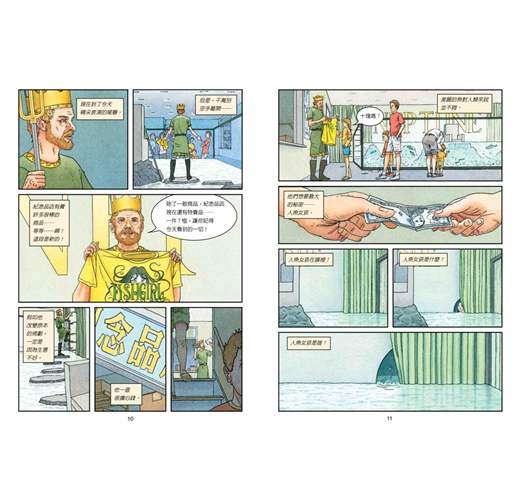 這本《人魚女孩》就是從人魚傳說發想而來的圖像小說。作者唐娜‧喬‧納波里是得獎無數的童書作家,對於神話及傳說有著高度興趣。在《人魚女孩》中,她以簡短的對話,描寫被囚禁在水族館的人魚,一直相信一個號稱是海神涅普頓的男人,相信是他拯救了自己。直到她意外認識一位年紀相仿的人類女孩,才漸漸發覺以往深信的都是謊言,於是她嘗試走出水缸、探索世界……故事中關於成長與獨立、真實與謊言的對照,值得細細思考。