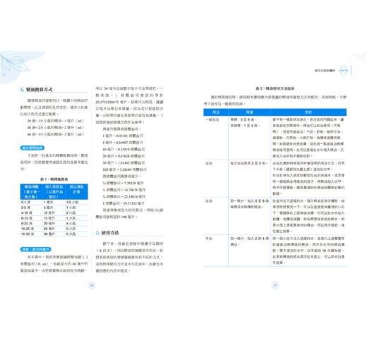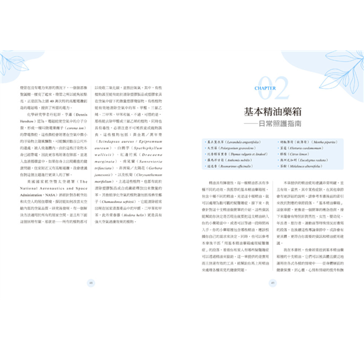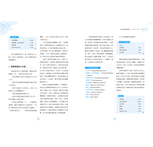 2.本書符合芳香療法初中階自修課程:這本書的豐富知識,為芳療新手打下良好芳療基礎,讓你學會運用手上的精油,將使用極大化;為剛剛通過或正在接受芳香療法課程的學生解惑更多的芳香療法的細節,也能釐清過往許多不懂的知識;為專業芳療師提供了授課教材的資源。