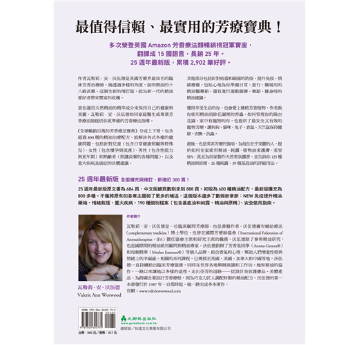 本書作者是英國IFA協會前主席瓦勒莉.安.沃伍德,她是英國芳療界最知名的臨床芳香治療師;本書結合療癒經驗和實證研究,以及許多第一手蒐集來的個案資料。她透過多樣的角度,說明精油的十八般武藝,能為新一代的精油愛好者帶來豐富的收穫。