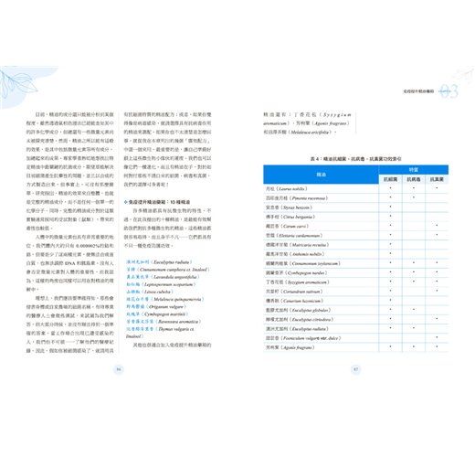 對象包括針對兒童(包含日常健康照顧與特殊兒)、女性(包含懷孕與流產)、男性(包含性能力與更年期)和熟齡者(照護長輩的各種問題);其他部分,主題包括病毒和細菌的防疫、提升免疫、情緒療癒,也貼心地為你準備日常、旅行、職場用的精油醫藥箱,還有避免運動傷害及消除疼痛(如:運動競賽、舞蹈、健身)的精油建議。