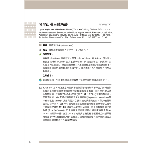 本書以阿里山地區植物的發現歷程做一系統性整理,共整理出62科120種以阿里為名之植物,是臺灣所有以地名命名的植物中,除了以「臺灣」命名之植物外,次高之地名;其中55種屬於臺灣特有種,是極具代表性之原生植物,又有17種被臺灣維管束植物紅皮書列為稀有保育等級,包含瀕危(EN)3種、易危(VN)5種、接近威脅(NT)6種及資料缺乏(DD)3種。撰寫計畫及間為了蒐集資料,也進行了實地的採集調查,過程中重新發現確認了阿里山松的存在,是此計畫意外的收穫,讓人為之雀躍。感謝協助本書審定的委員給予寶貴的意見及修訂建議,以及許多提供圖片的單位及師長,讓本書更加精采可讀。也要感謝林務局嘉義林區管理處諸位長官及承辦人員在撰寫計畫期間給予的協助。