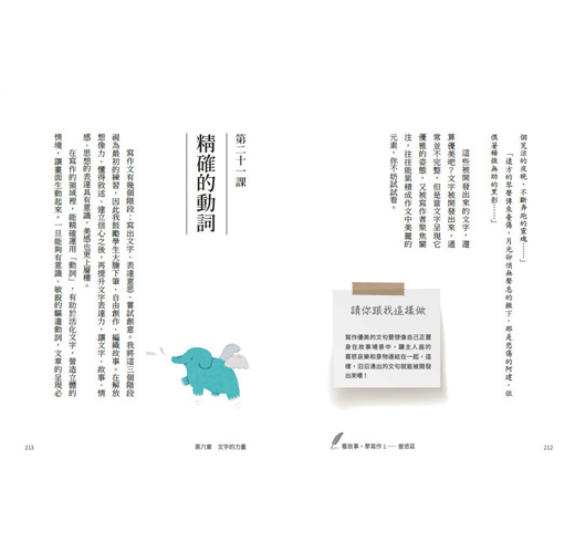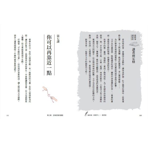 每課之後,還有「牛刀小試」。在前面老師作足示範、引爆想像思考、給足信心、吊盡胃口後,小讀者們已經忍耐不住想要自己動筆試試。不管真正書寫,還是說說想想,都可。最後再參照「請你跟我這樣做」的貼心提醒和重點回顧,參與思考的寫作書,有了小讀者的真正練習,才能算是真正的閱讀完成。