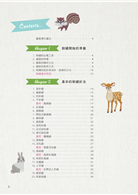 看完基本流程後,接著依照【動物園的動物們】、【牧場的動物們】、【家庭寵物們】、【森林的動物們】四大主題,傳授24款動物刺繡的方法,包括:呆萌無尾熊、溫馴長頸鹿、華麗的紅鶴、粉紅小豬、溫馨母雞帶小雞、棉花糖小羊、傲嬌貓咪、可愛屁屁柴犬、靈動的鸚鵡、小鹿斑比、捲尾巴松鼠、甜美的兔子……一針一線親手繡出插畫風Q萌動物,好療癒啊!