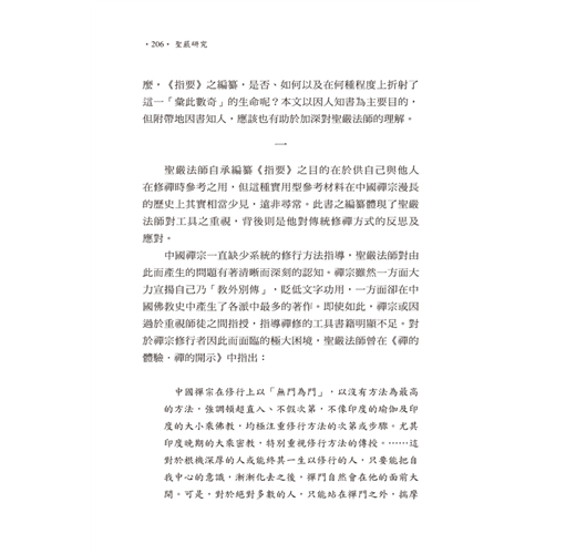 聖嚴法師擇取二十四篇歷代禪門重要文獻,編成了《禪門修證指要》一書以供自己和他人在修禪時參考。對此自稱「述而不作」的編著,本文嘗試討論其選擇、說明和述評在事實上所體現的一些重要觀念、其間的內在緊張、聖嚴法師有意無意的解決之道,以及遺留的問題。