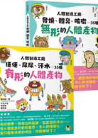 本套書(共二冊)收錄了71個人體製造的有形和無形產物,將這些產物按照它們所在的部位、特徵,以及產出方式等,繪製成一個個動感十足的可愛角色,並給予詼諧有趣的命名,讓讀者可以在邊讀邊笑中,不知不覺與這些角色產生親近感,進而了解、認識自己的身體與生理機能。例如有形產物中的「痰超人」,手抱著許多病菌,努力往外飛去,為什麼呢?原來痰的出現是因為病菌入侵肺部,為了抵擋,「痰」就像超人般的英勇出現,把病菌通通趕到體外去!而無形產物中的「莫放屁娜」,則是穿著大花內褲,一邊吃著地瓜,一邊「噗——」的放了大響屁。原來吃富含纖維的食物會在腸胃道產生許多氣體,不得不釋放出去。但幸好響屁不臭,臭屁不響,這句俗諺真是「屁」的最好寫照。