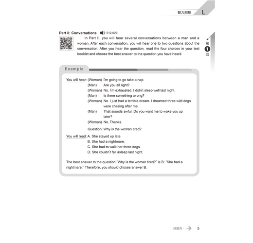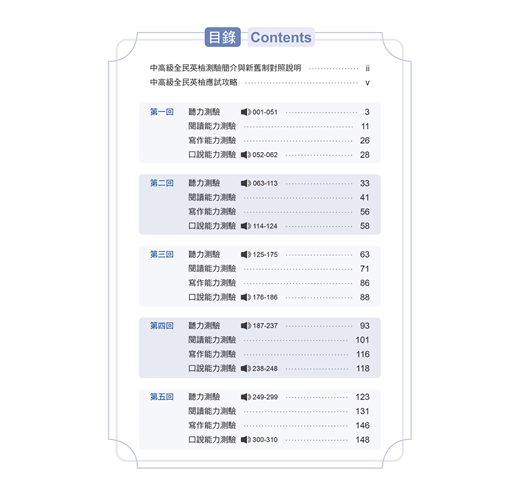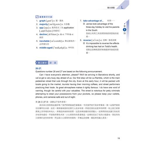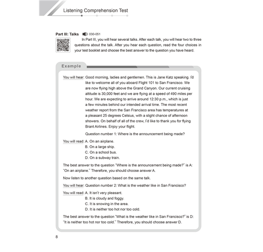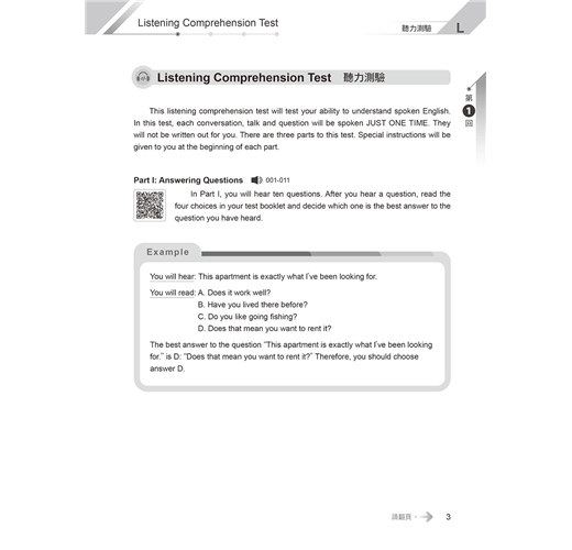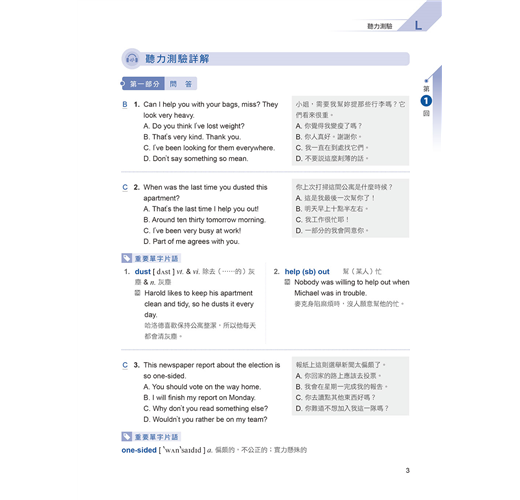 題目難度稍高於正式考題,聽力測驗速度較正式考題略快,並由專業外籍錄音老師錄製,讓你臨場應試無往不利!