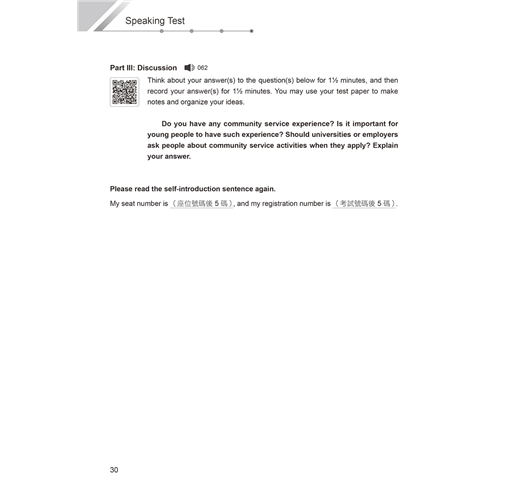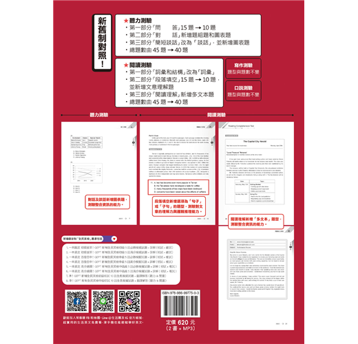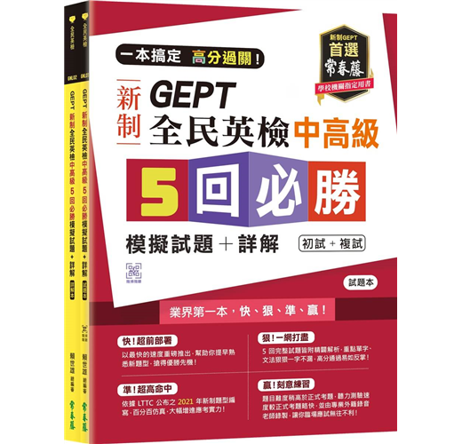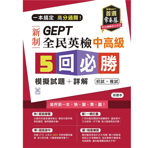 以最快的速度重磅推出2021年全民英檢新制題型之模擬試題。依據 LTTC 公布之 2021 年新制題型編寫,題目難度稍高於正式考題,聽力測驗速度較正式考題略快,只需掃描 QR Code 便能進行測試超便利,5回完整模擬試題幫助你累積作答經驗,讓你掌握正式考試節奏!