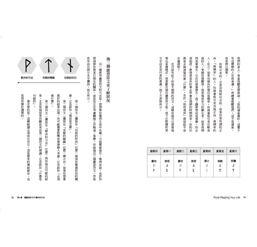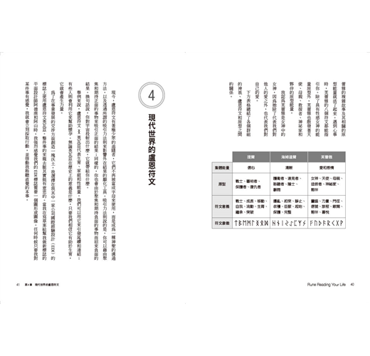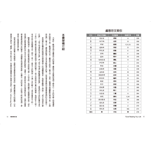 此外,我也列出每個盧恩符文的代表意義。其他許多盧恩符文相關書籍為每個符文提出更多 的複雜解釋,分析佚名者的《艾達史詩》和十三世紀冰島作家斯諾里.斯圖魯松(Snorri Sturluson) 所寫的詩詞的意義。學者可能會認為那才是解釋盧恩符文的恰當方式,但我的目標不是要分析歷 史,而是提供你一個可理解又適用於今日的解釋,不必過度依賴那些可能不完整的文獻。就像古老 的俗話說的,歷史是贏家寫的。我們不知道我們所不知道的。在解釋和重述歷史時,人人都有自己的 過濾器。話雖如此,我對於告訴大家每個符文的現代意義感到很自在,學術的解釋就留給學術吧!