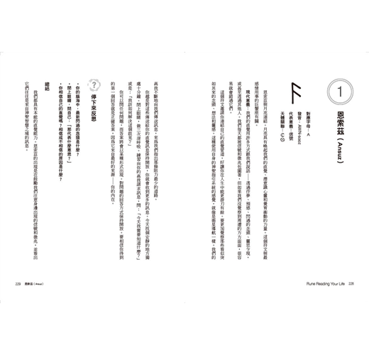 如果你對於將盧恩符文的現代意義應用在生活中感到有困難,這個部分提供了「停下來反思」 的問題,促進你將這些意義應用在你所詢問的狀況中。倘若你發現這些促進是有用的,可以將它們 記錄下來— 如果你想這麼做的話。