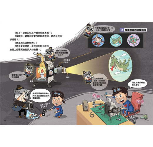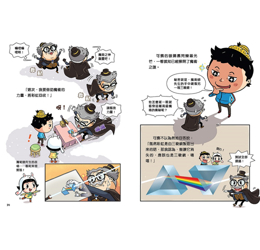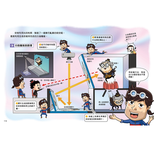 本書以生動的彩色漫畫故事穿插豐富的科學知識,例如:光的折射及錯覺、投影機、三棱鏡、激光光線的原理、光的顏色等,吸引小朋友閲讀和對科學的興趣,並用圖像整合難懂概念,讓孩子能輕易吸收核心知識。