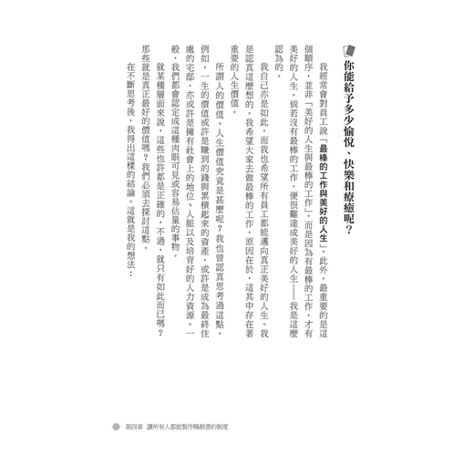 從事愈棒的工作,就愈能產出大量如愉悅、快樂和療癒等的人生價值。因此要將自己放在變化性高的場所,透過工作學習、改變,進而提升自我價值,實現最美好的人生。