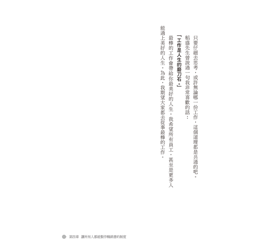2. 作者曾和稻盛和夫、船井幸雄、近藤麻里惠等大師多次合作,眼界寬廣、底蘊深厚。身為長者的他以平易近人的文字及豐富實例,娓娓道來他對企業經營、人才培育的心得,並分享富有傳奇色彩的人生經歷,為迷茫不安甚至失去鬥志的這一代人,帶來最溫暖真誠的啟示。