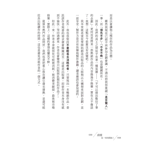 本書雖然以出版業為例,但其理念適用於任何「創造價值」的產業。身為出版社經營者,植木宣隆老師坦承暢銷書底下固然有更多屍橫遍野的無名書,但他堅守每一個可以創造暢銷書的契機,相信一切從每一個人認真看待自己的起心動念開始,然後誠懇地把這個想法當真,以近乎偏執的態度付諸行動。而這樣的體悟適用於不同人生階段、生涯規劃,因為唯有自己先把想法當真,才能孕育出隨之而來的熱情和能力。