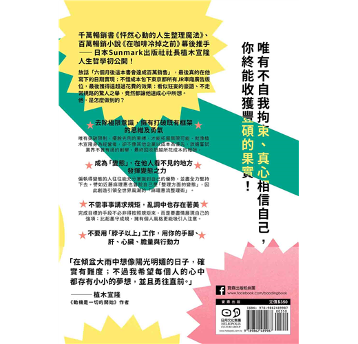談如何創造暢銷書的訣竅很多,少有談如何創造十年不墜的長銷書;談如何培養優秀作家的書很多,但少有談如何培養編輯跟作者一起完成一本書的能力;談出版經營理念的書很多,但少有回歸核心產物-書,把書當作為了廣為流傳的「能量體」來製作。現任日本Sunmark出版社社長植木宣隆老師歸結超級暢銷書的心法不外乎所有人,從作者、編輯到讀者,認真看待起心動念,而且用近乎變態的執著付諸行動。