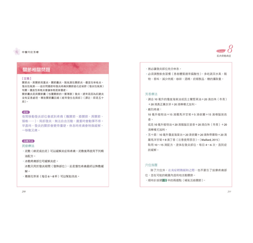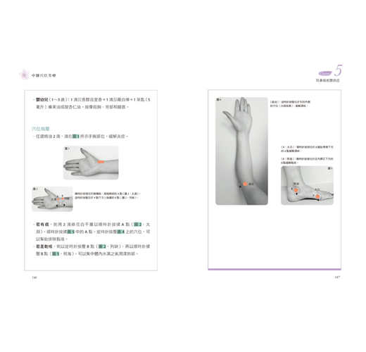 每個穴位都有圖片標示位置,並解釋得很詳細,讀者能輕易找到穴位點,使用精油或根據指示直接「按摩」。