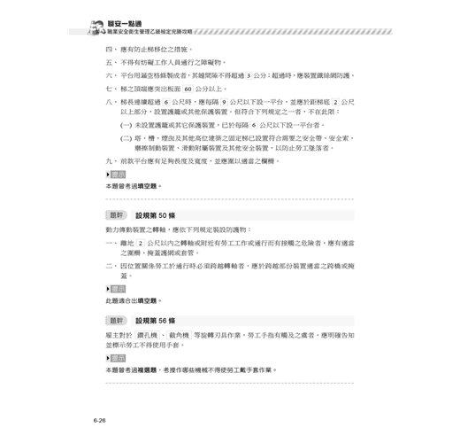 職業安全衛生法施行細則、職業安全衛生設施規則、職業安全衛生管理辦法、營造安全衛生設施標準、起重升降機具安全規則、危險性工作場所審查及檢查辦法、製程安全評估定期實施辦法、女性勞工母性健康保護實施辦法、勞動檢查法、勞動檢查法施行細則