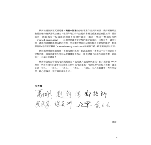 本書作者為職業安全衛生界最具經驗之專家、名師,結合20年以上教學輔導經驗,上萬名學員口碑保證,合力打造最優質考試參考書籍。