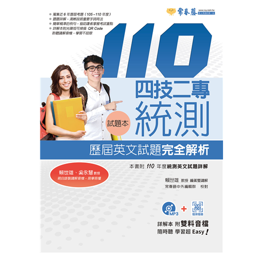 本書蒐集歷屆試題 6 回。讀者可先將本書試題本從頭到尾完整做完,充分了解歷屆考題的內容與題型。仔細聆聽音檔內賴世雄教授和資深講解老師奚永慧(Wesley)的試題解說,邊聽邊詳記筆記。反覆閱讀詳解本解析至少兩遍以上,特別圈註重要字詞及相關用法。最後請重複聆聽講解音檔,樹立基本答題概念與應考能力。這種視聽雙管齊下的方式最能在短時間之內迅速培養職校同學的英文功力。並且為了讓同學能夠隨時隨地學習,我們特地將音檔都上傳雲端,同學只要掃瞄 QR Code,就能馬上用手機播放音檔,學習不設限,好用又方便。若能配合本書用心學習,當可輕易奪取高分,進入理想的大學,這也是我們最大的期望!