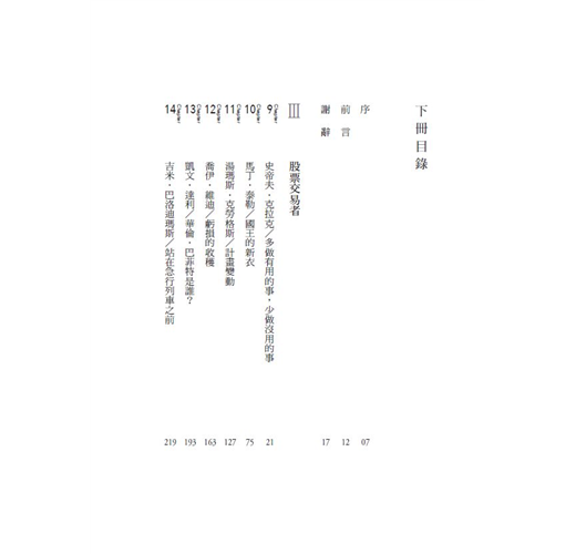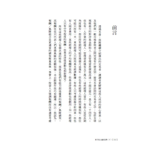 本書將以全球知名的對沖基金經理人作為訪談主角,包括全球規模最大的對沖基金創始人瑞.達利歐、縱橫賭場與華爾街的「計量金融之父」愛德華.索普、《你也可以成為股市天才》作者兼神奇公式發明人喬爾.葛林布萊特,以及暢銷書《大賣空》中敲醒次貸風暴警鐘的經理人傑米.麥伊等,全都是投資圈赫赫有名的人物。透過史瓦格兼具深度與廣度的訪談內容,讓讀者能一窺這個充滿神秘色彩的對沖基金領域,並瞭解他們如何在低風險的情況下,創造出難以仿效的優異報酬。