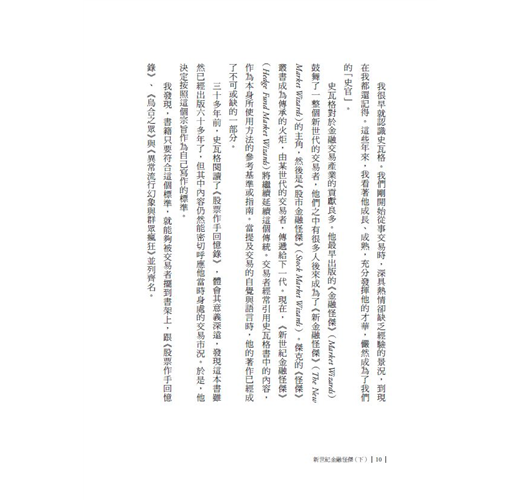 「我在20年前剛開始投資者的工作時閱讀了傑克.史瓦格的第一本《金融怪傑》,它著重於交易心理以及了解自己的重要性。而他最新的著作又是另一個傑作,他點出了適用於現今市場中所有的投資者全新的觀點。任何閱讀了這本書人,都能在許多層面上豐富自我。因為交易就是生活,生活就是交易。」——克利斯.凱馳博士,www.SelfishInvesting.com創辦人,《他們如何超越歐尼爾》作者
